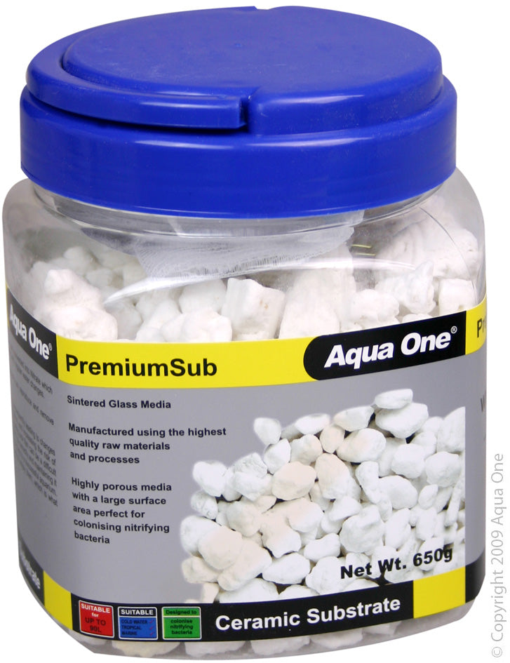 Aqua One PremiumSub is an extremely porous sintered glass biological media that can be used in all types of filtration systems such as pressurised canister filters, hang on filters, internal filters, and wet/dry filters. PremiumSub provides the most ideal environment for the cultivation of denitrifying bacteria, due to its porous nature. PremiumSub is a key component to a healthy and productive biological filtration system.