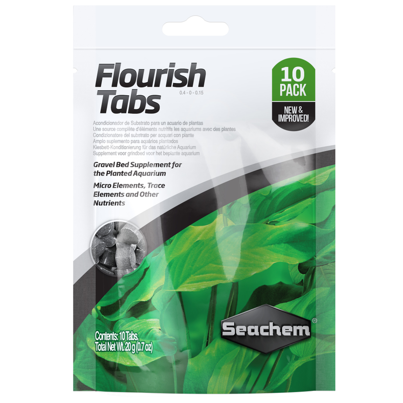 Flourish Tabs™ are growth-stimulating tablets for plant roots. They contain essential trace elements, amino acids, and vitamins. They are rich in iron, manganese, magnesium, calcium, potassium, inositol, choline, B12, biotin, and other factors that have been determined to be beneficial to aquatic plant roots. They contain no phosphate or nitrate that would promote algae proliferation. Each pack of ten tablets treats a 12 X 30 inch plant bed twice.