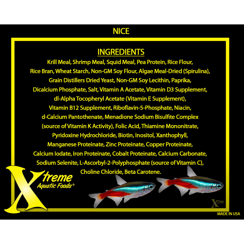 Xtreme NICE Pellets are something quite different and a great secondary food to really boost your fish’s natural colours. NICE stands for Naturally Intense Color Enhancer and these slow-sinking 1.5mm pellets will sink slowly through the aquarium’s water column. We recommend feeding only what can be eaten in 3 minutes, 5 tops.